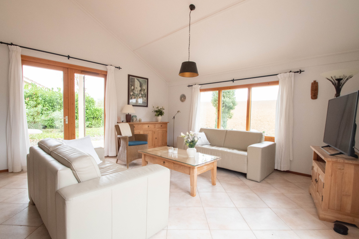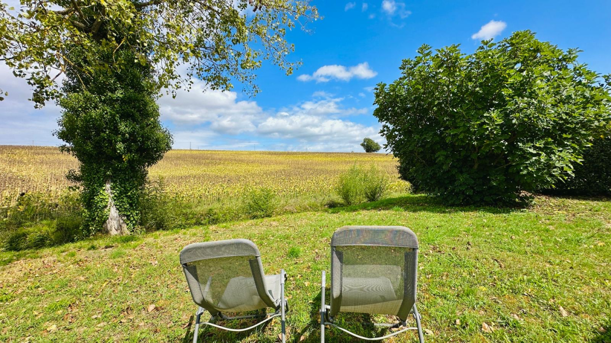 Terrasse ensoleillée avec vue dégagée sur la nature.