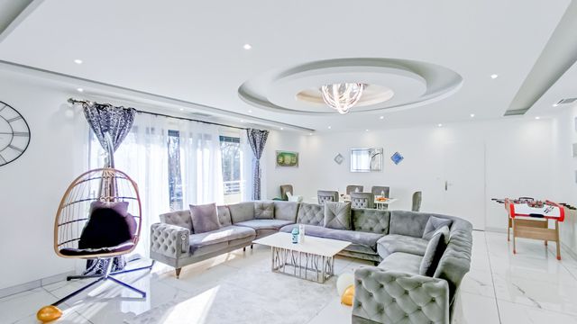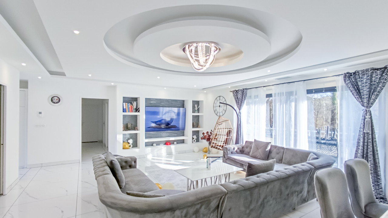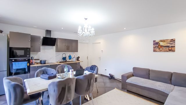 The first: Entrance opening onto a large, bright living room with false ceiling and integrated light fittings with terrace access, 1 beautiful closed kitchen with central pilot, utility room, 3 bedrooms, 1 bathroom with shower, 1 separate toilet.