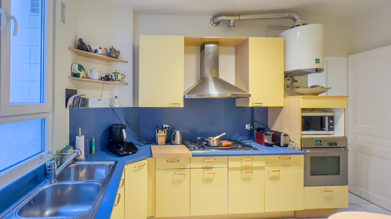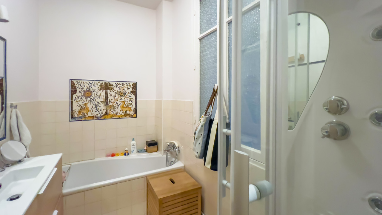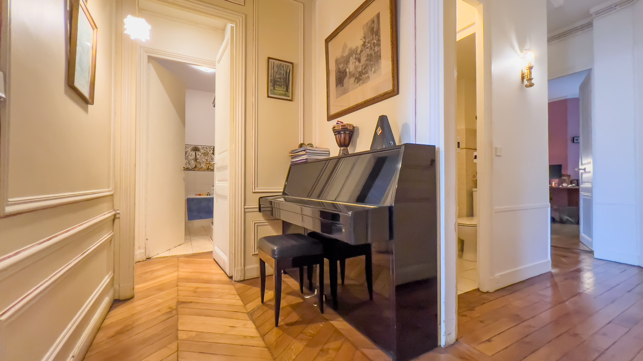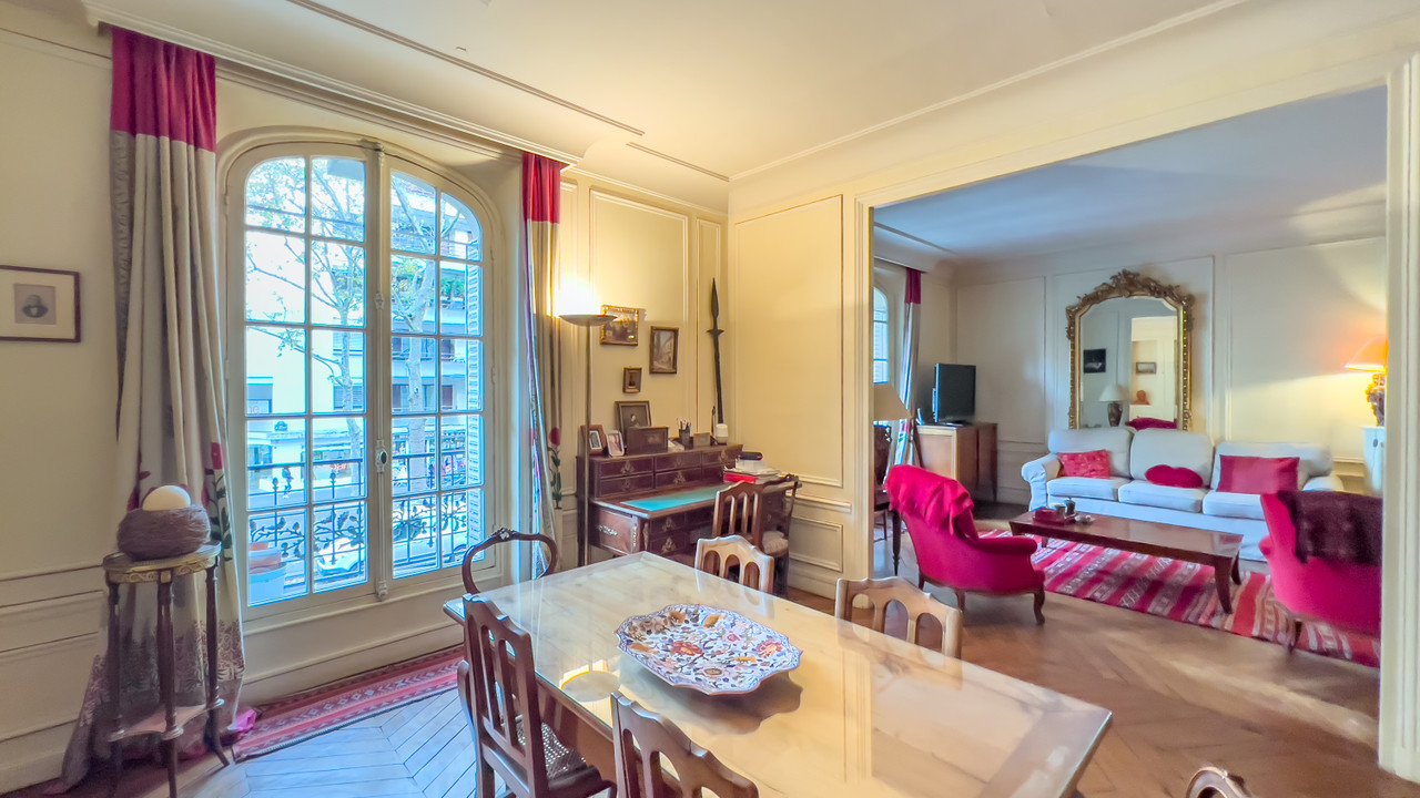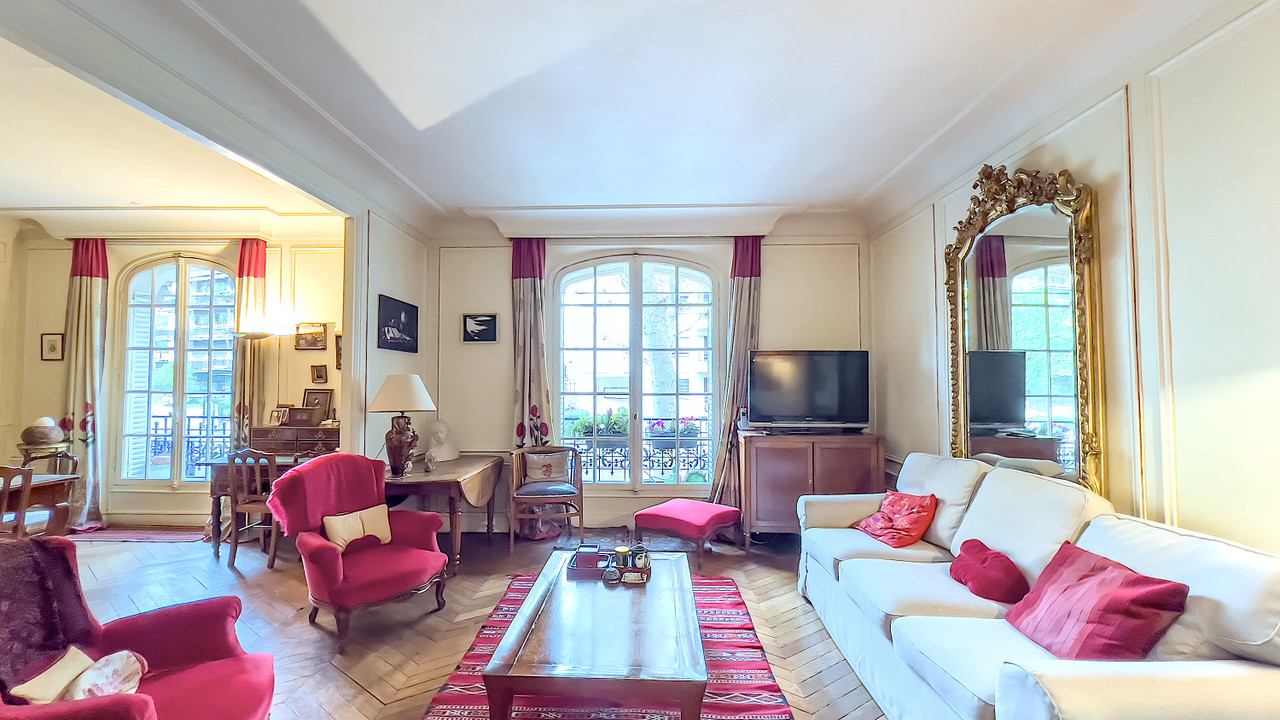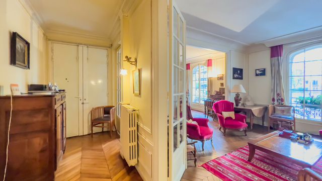 A41258DPE75 - A particularly chic location, ideally situated between the Seine and the village of Auteuil, beautiful modular 3 bedrooms apartment of 123,89 m², dual-aspect and benefiting from all the charm of the old (herringbone parquet flooring, mouldings). Located on the first floor of a superb Art Nouveau building with lift, dating from 1913, secure, well maintained and on a human scale, it stands out for its exceptional double-glazed arched windows and 2.85m high ceilings.