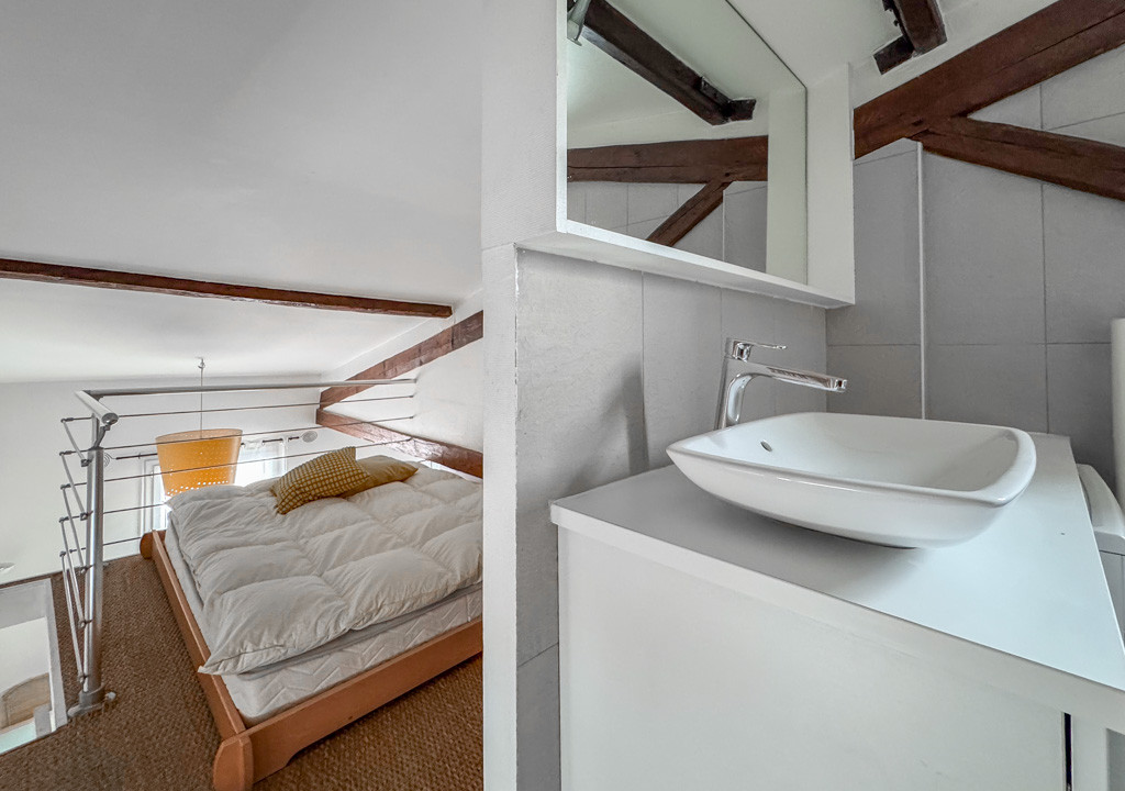 With a surface area of 42 sqm (Carrez Law) and 47 sqm total floor space, the apartment includes an entrance hall leading to a bright living room with an open, fully equipped kitchen, a mezzanine sleeping area with an en-suite bathroom, and a separate toilet.