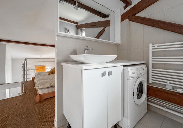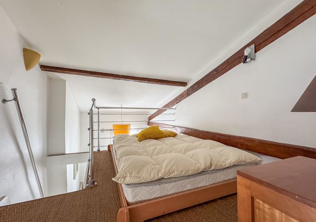 With a surface area of 42 sqm (Carrez Law) and 47 sqm total floor space, the apartment includes an entrance hall leading to a bright living room with an open, fully equipped kitchen, a mezzanine sleeping area with an en-suite bathroom, and a separate toilet.