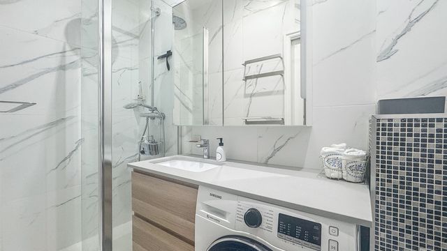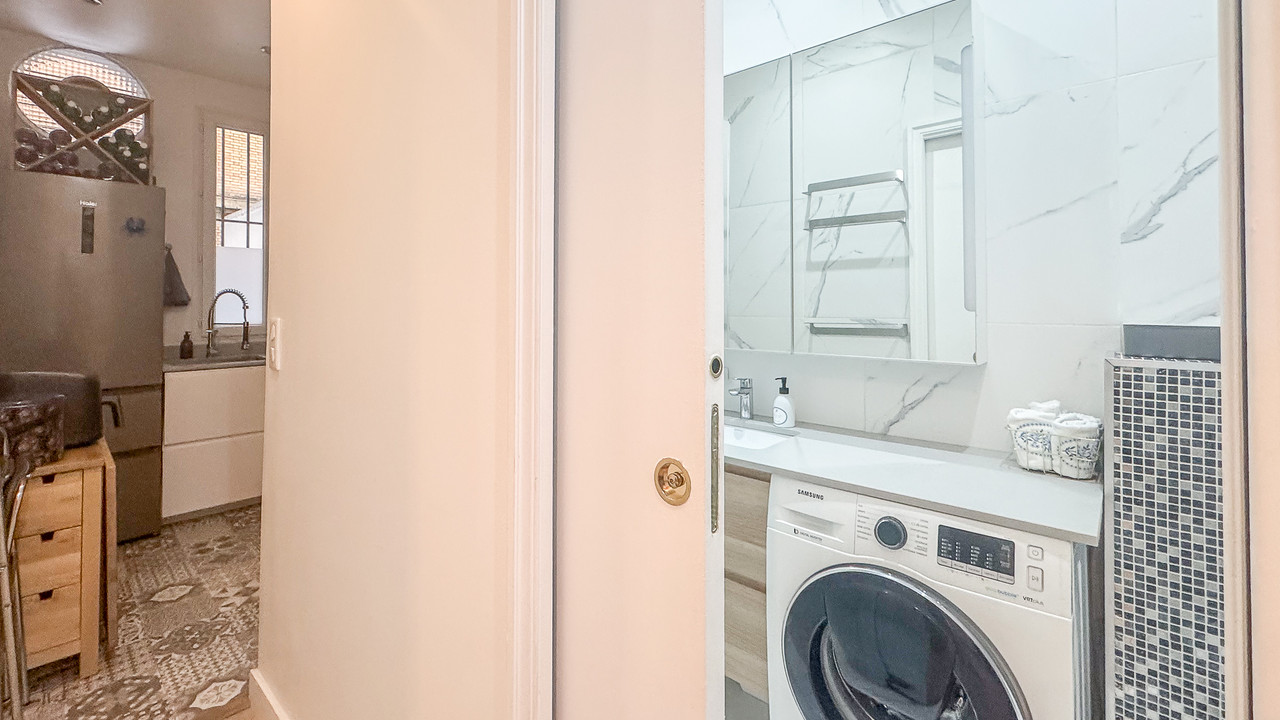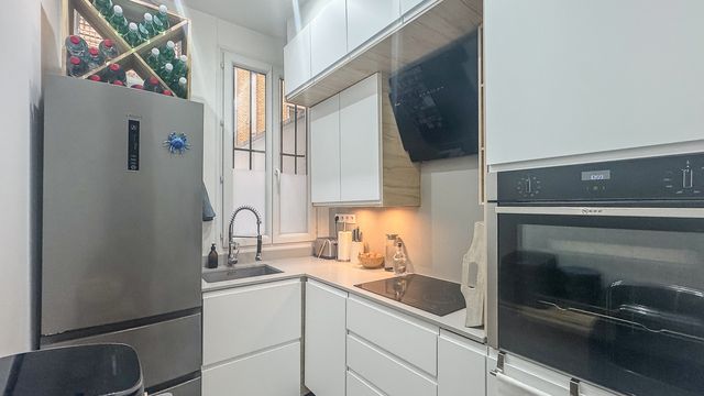 Fully furnished and equipped, it features an entrance with built-in storage, a spacious living room, and a modern, fully fitted ergonomic kitchen.