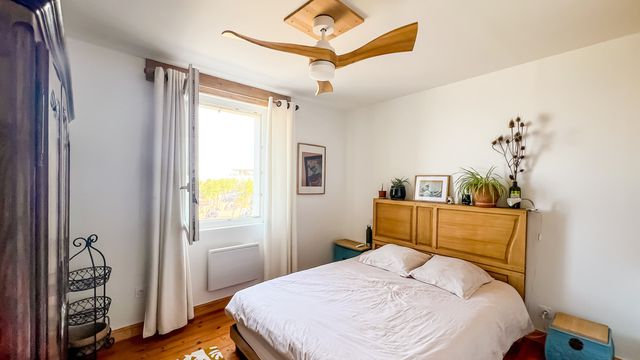 Two comfortable bedrooms (11.5 and 12.5 m²), both with ocean views and original wooden floors, plus a refined sea-facing bathroom.