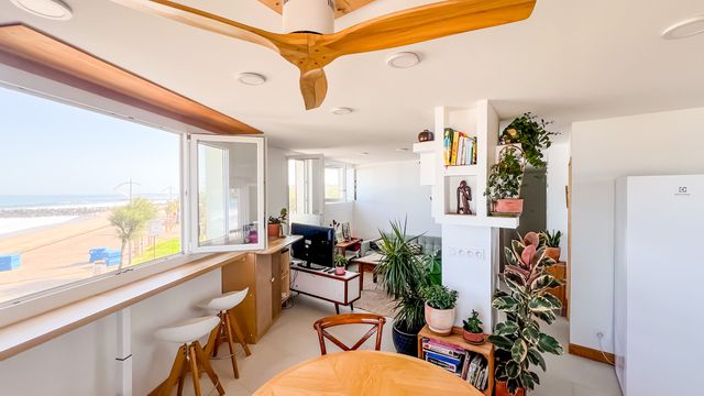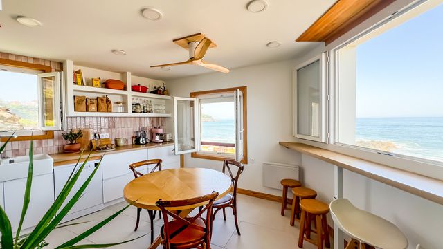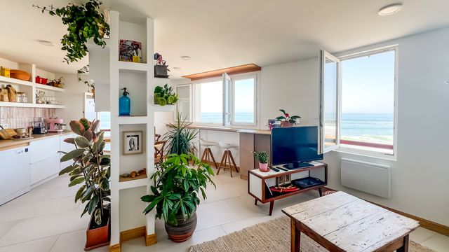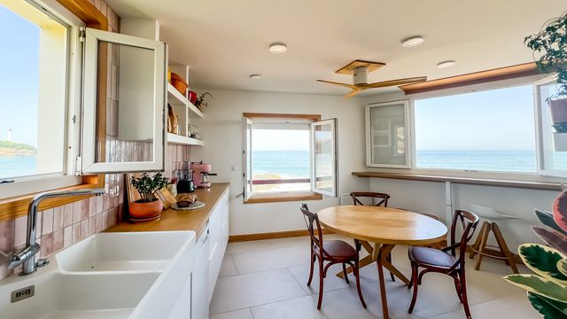 The upper level features a bright and inviting 30 m² living space with panoramic views over Anglet Bay and the Biarritz lighthouse, a cosy lounge, and a dining area separated by a unique central pillar.