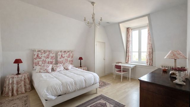 The main house offers on the ground floor a hallway, an east/west facing living room with fireplace and high ceilings (over 3 m), as well as a separate kitchen opening onto a covered terrace with electric shutters and an enclosed garden. The upper floors feature six bedrooms, a bathroom, a shower room and two WCs.