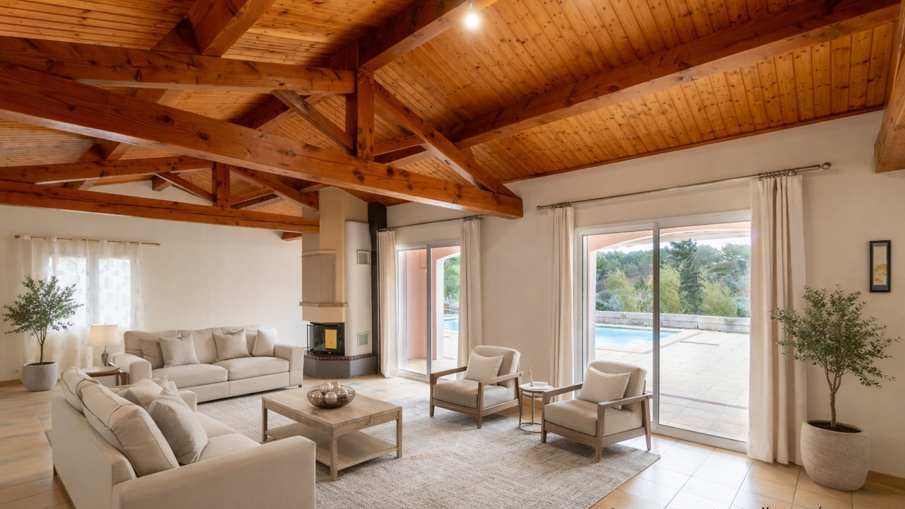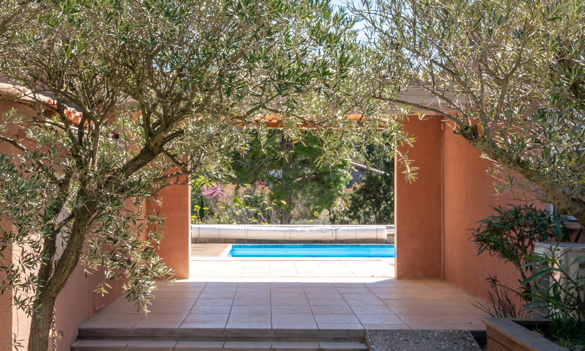 A42173CYV11 - Detached villa in a quiet residential area of Narbonne, just 5 minutes from the city centre. Built in 1992, the property offers flexible accommodation, multiple entrances, a large south-facing terrace of approx. 180 m² with open views, and a 10 x 5 m swimming pool with electric safety cover. Fully enclosed garden, summer kitchen, wine cellar, laundry room and carport for three cars. Four bedrooms, three already benefiting from en-suite bathrooms, with the possibility to create a fourth en-suite bedroom. Energy-efficient features include solar panels, thermodynamic water heater and borehole. Ideal family home close to town and coast.
