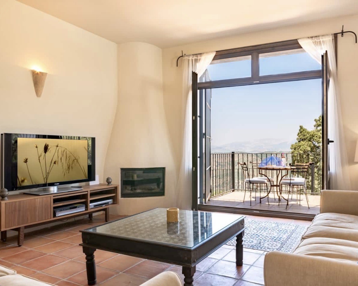 The internal courtyard is at the centre of the house. From here doors and stairs lead to its various wings. One door leads directly into the hub of the house, the main very spacious open-plan living area, divided into different spaces. Moving through to the sitting, dining and kitchen areas, on one side is a well equipped kitchen. From the kitchen, large glass doors open onto the pool area and covered porch, with various seating areas. On the other side of the room, in the living area, French windows open onto a terrace with wonderful views. The two downstairs bedrooms are accessed by a door from the living room. The first is a twin with en-suite shower room, the other a double bedroom with en-suite bathroom and access to a private terrace enjoying excellent views. On this ground level there is also a toilet/laundry room, accessible from the dining area or from the pool area.