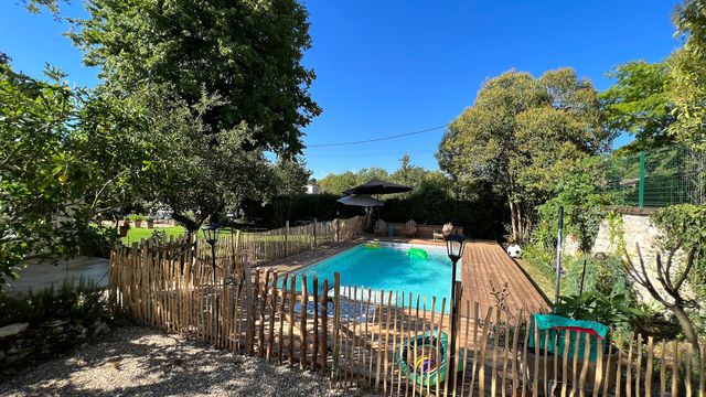 Outside a heated swimming pool sits at the end of the mature and pretty garden.