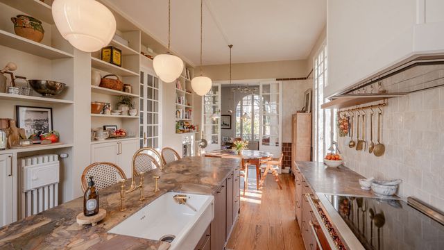 The main house offers three double bedrooms and three reception rooms. It is light and airy with high ceilings throughout, complemented by beautiful oak flooring, plenty of character, and a high-quality renovation finished to an excellent standard. At its heart is a show-stopping new kitchen, complete with a bespoke Lacanche range, ideal for both everyday living and entertaining.