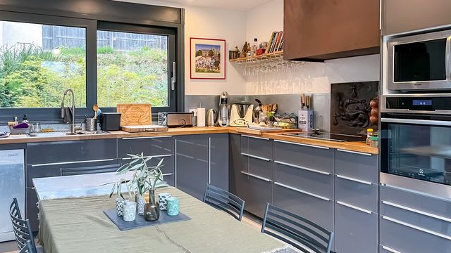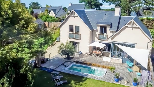 This architect-designed villa in the highly sought-after village of Saint-Briac-sur-Mer is just 700 m from beaches, shops, and restaurants, and less than 5 minutes from Dinard Golf Course. Set in a quiet residential area, privacy is assured with gated access and gardens below street level.