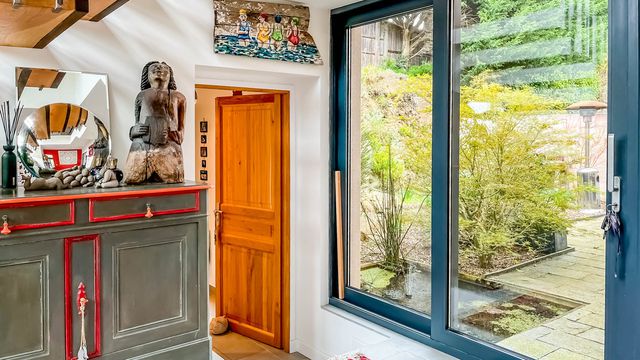The 4-bedroom home, including two en-suite bedrooms, is filled with natural light, featuring high ceilings, cosy corners, and versatile spaces perfect for family living, entertaining, or remote working. Highlights include a spacious living room with fireplace, modern kitchen, mezzanine, underfloor heating, solar panels, and wine cellar.
