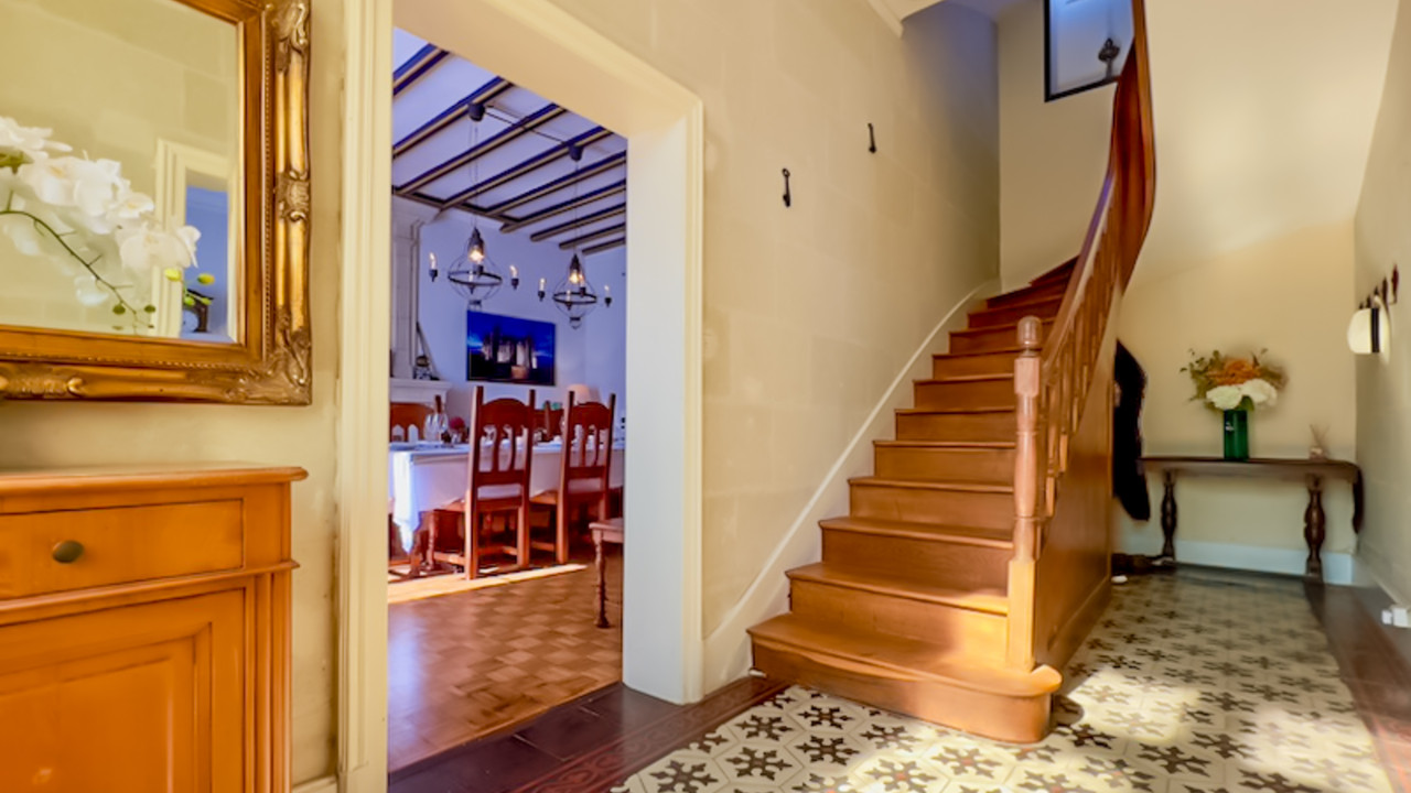 It features beautiful original geometric tiles, superb high ceilings, gorgeous wood floors, stone and marble fireplaces, wood paneling, and a fabulous staircase.