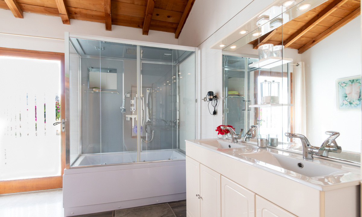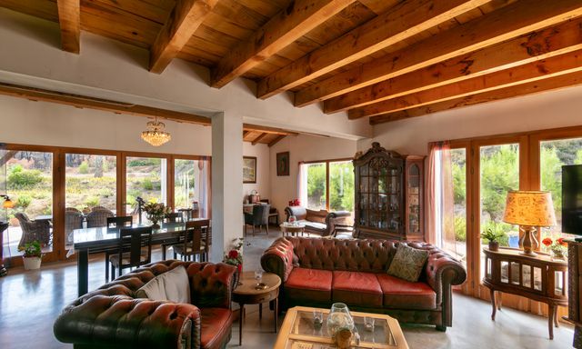 A covered 60 m² terrace invites you to enjoy outdoor living year-round. Practical features include a 100 m² double garage, laundry room, dressing rooms, sauna, wood burner, pellet stove, natural spring water system, and certified septic tank.