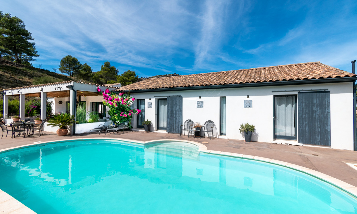 A39906JAV11 - In the heart of the Corbières, this beautifully renovated 222 m² single-storey villa (2009) offers elegance, comfort, and total privacy with breathtaking valley views. Set on 3,000 m² of Mediterranean gardens, it features a luminous 50 m² living room, open kitchen, library, and a luxurious master suite with Jacuzzi. Two further bedrooms open onto terraces and the heated 11 x 5.5 m pool.