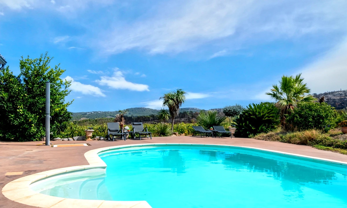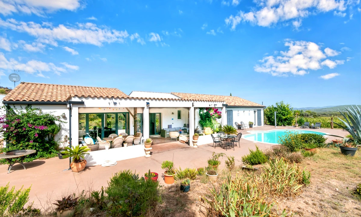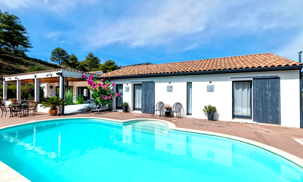 A39906JAV11 - In the heart of the Corbières, this beautifully renovated 222 m² single-storey villa (2009) offers elegance, comfort, and total privacy with breathtaking valley views. Set on 3,000 m² of Mediterranean gardens, it features a luminous 50 m² living room, open kitchen, library, and a luxurious master suite with Jacuzzi. Two further bedrooms open onto terraces and the heated 11 x 5.5 m pool.