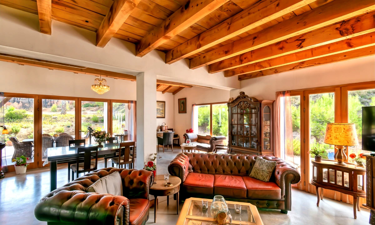 A covered 60 m² terrace invites you to enjoy outdoor living year-round. Practical features include a 100 m² double garage, laundry room, dressing rooms, sauna, wood burner, pellet stove, natural spring water system, and certified septic tank.