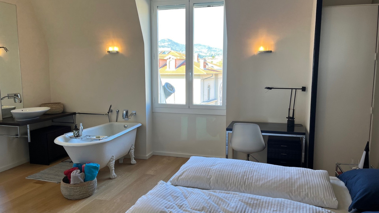 In a sumptuous bourgeois palace overlooking the city and the sea, discover this magnificent contemporary apartment on the top floor, facing south with an exceptional sea view.