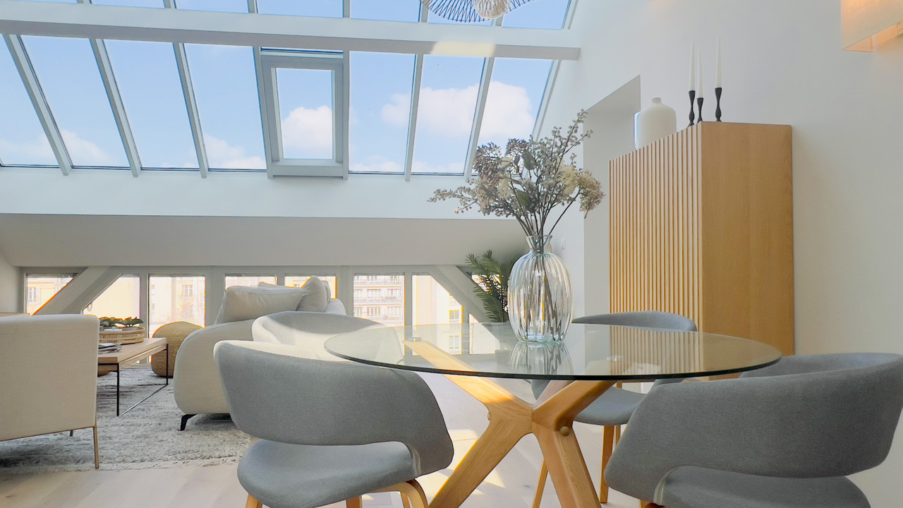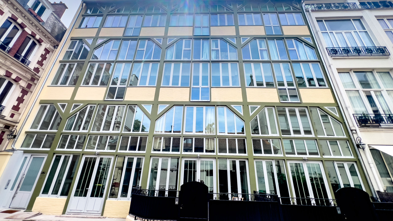 A24899DPE75 - Paris 75016 - Between Champs-Élysées and the Eiffel Tower - 95,56m2 - Exceptional top floor 2 bed fully renovated apartment in a stunning new renovation of a 1901 building originally conceived as artists' studios. This duplex loft style apartment, nestled behind a superb timber-framed facade with glazed rooves bathing the generous spaces below in light, offers a unique environment oozing Parisian chic at the heart of the Trocadéro district. The residence astutely blends the building's original artistic vocation with the über-modern, high-quality, environmentally friendly living sought by discerning 21st century buyers. The 5th floor sleeping area includes an entrance hall, 2 bedrooms, 2 bathrooms, WC and laundry. The 6th and top floor features a living room with a new contemporary, fully equipped open-plan kitchen and WC. Huge windows in the main rooms give an unobstructed view of the discreet, leafy, cul-de-sac, a rare privilege in such an exceptional location in the French capital.