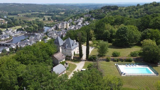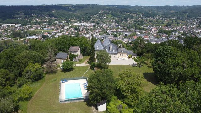 A19796AM24 - ‘ This exceptional property offers so much as a year-round family home or a lovely holiday home. It is completely private, set in ample grounds comprising terraces, gardens, meadow and woodland. There are amazing views over the vibrant, popular old town of Terrasson and across the Vézère valley. The property is within easy access of all the shops, services and restaurants of this historic town. It features a large swimming-pool (12mx6m), oil-fired central heating, 6 bedrooms ( four are en-suite) and a further shower room and utility room. There is also a cellar and large outbuildings which can serve as storage and a workshop with potential for conversion to a cottage.'