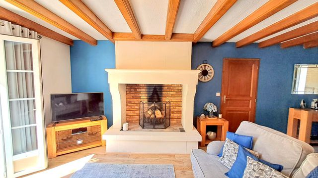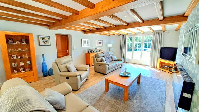 The dining room boasts 37m2 of space and a gorgeous stone fireplace, double patio doors to the garden and a wood effect tiled floor.