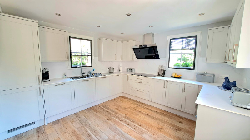 The fabulous 33m2 fitted kitchen has Neff fitted appliances to remain for the sale ( 2 ovens, induction hob etc) all integrated white goods, triple patio doors to the garden, and underfloor heated tiled floor. It also has an island breakfast bar