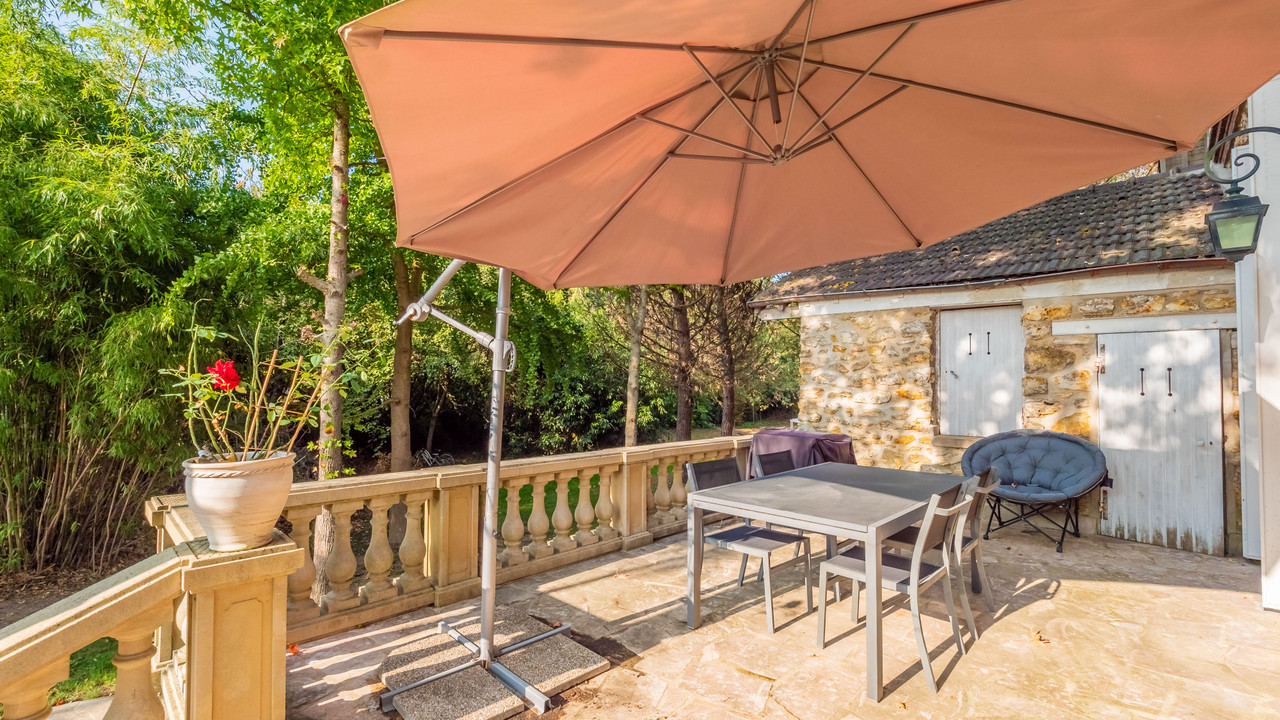 A42823BTX78 - Sole Agency - Yvelines - Between Villennes (78670) and Evecquemont (78740) and the future RER E - 19th-century residence located on a private, guarded island on the banks of the Seine with a private jetty. 10 rooms. 6 bedrooms. 6 bathrooms. Large reception rooms. High-end kitchen and utility room. 70m² master suite. Parquet flooring, period tiles, mouldings and fireplaces lend this residence undeniable charm. Cellar. Terrace overlooking a 2,600m² landscaped park leading to the river.