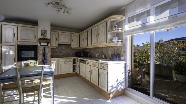 6-room top floor apt., 155m², 30m² terrace, 10m² balcony. 6 rooms, 4 beds, 1 bath, 2 showers, Garage