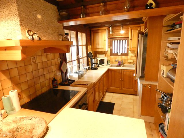 The large wooden chalet (180m²) has balconies and verandas overlooking the park. On the ground floor, there is a fitted kitchen (8m²) opening onto a large, bright living room (40m²) with a fireplace insert, a 14m² bedroom and a modern bathroom.