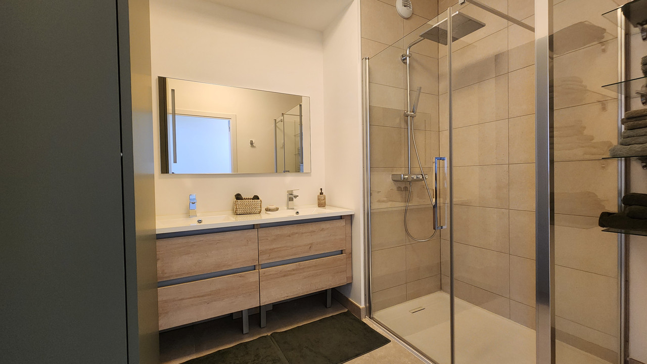 The property offers a spacious 50 m² living area with an open-plan kitchen, creating a bright and welcoming space that opens directly onto a 14 m² balcony. The apartment includes a 14 m² master bedroom with its own private shower room and toilet, as well as a second bedroom of 13 m².