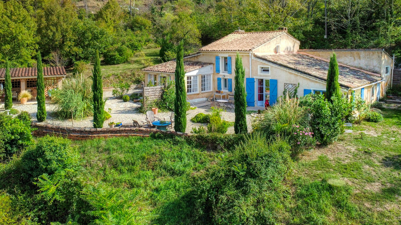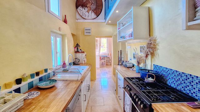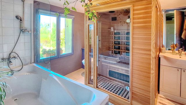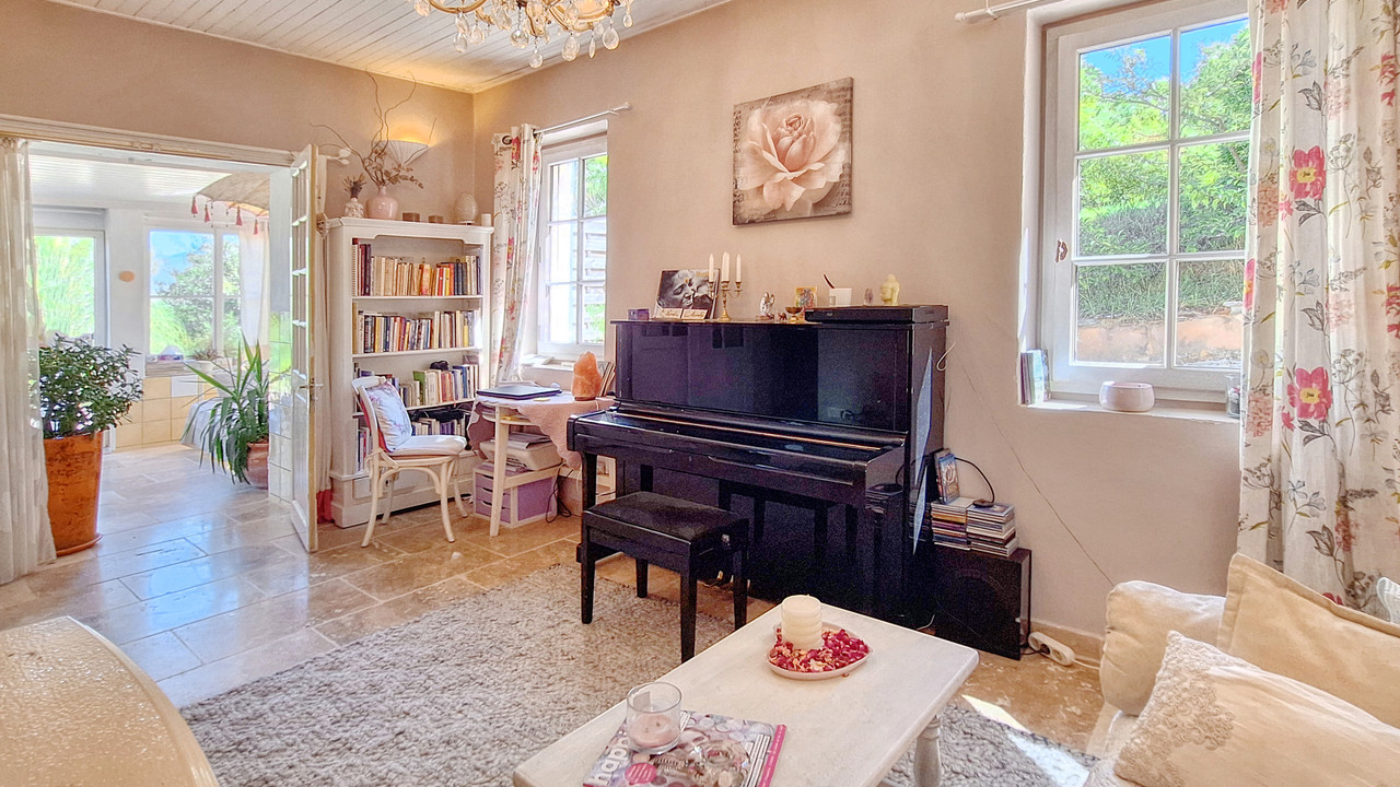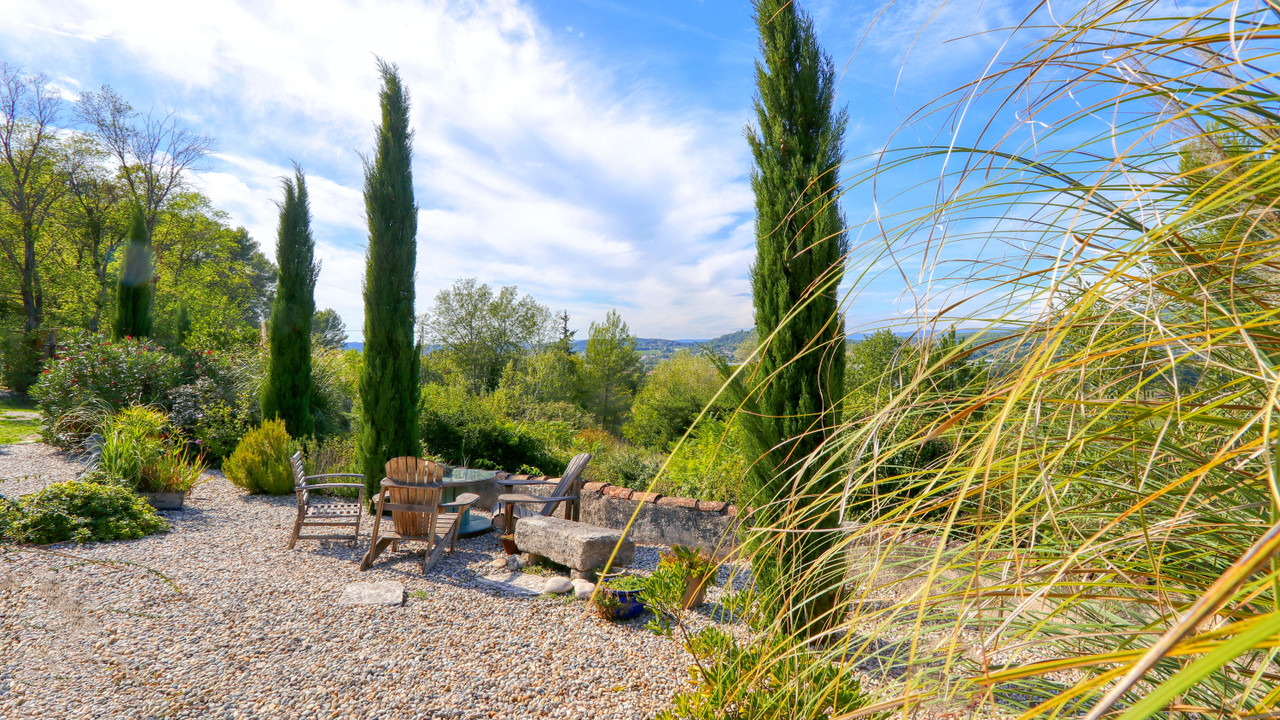 A36223NDL84 - Close to Apt, yet completely private, this characterful 1881 property charms with its authenticity, peaceful setting and stunning panoramic views over the Pays d'Apt. Without overlooking neighbors. A true haven, it opens onto a beautifully landscaped garden with terraces and hidden corners, ideal for relaxation and contemplation. The main house welcomes you through a bright conservatory leading to a cozy living room, a kitchen and a spacious bedroom with shower room, WC and an infrared cabin for moments of well-being. The fully equipped kitchen offers stunning views on the landscape.