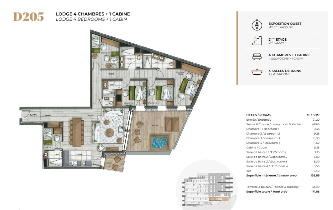 There will also be a ski retailer, restaurant and roof top bar to enjoy the delightful, high altitude location in the no.1 ski resort of Tignes. This beautifully designed 4 bedroom apartment with an additional cabine bedroom can sleep 9 / 10 people in luxurious comfort.