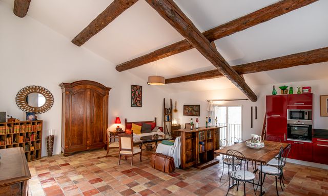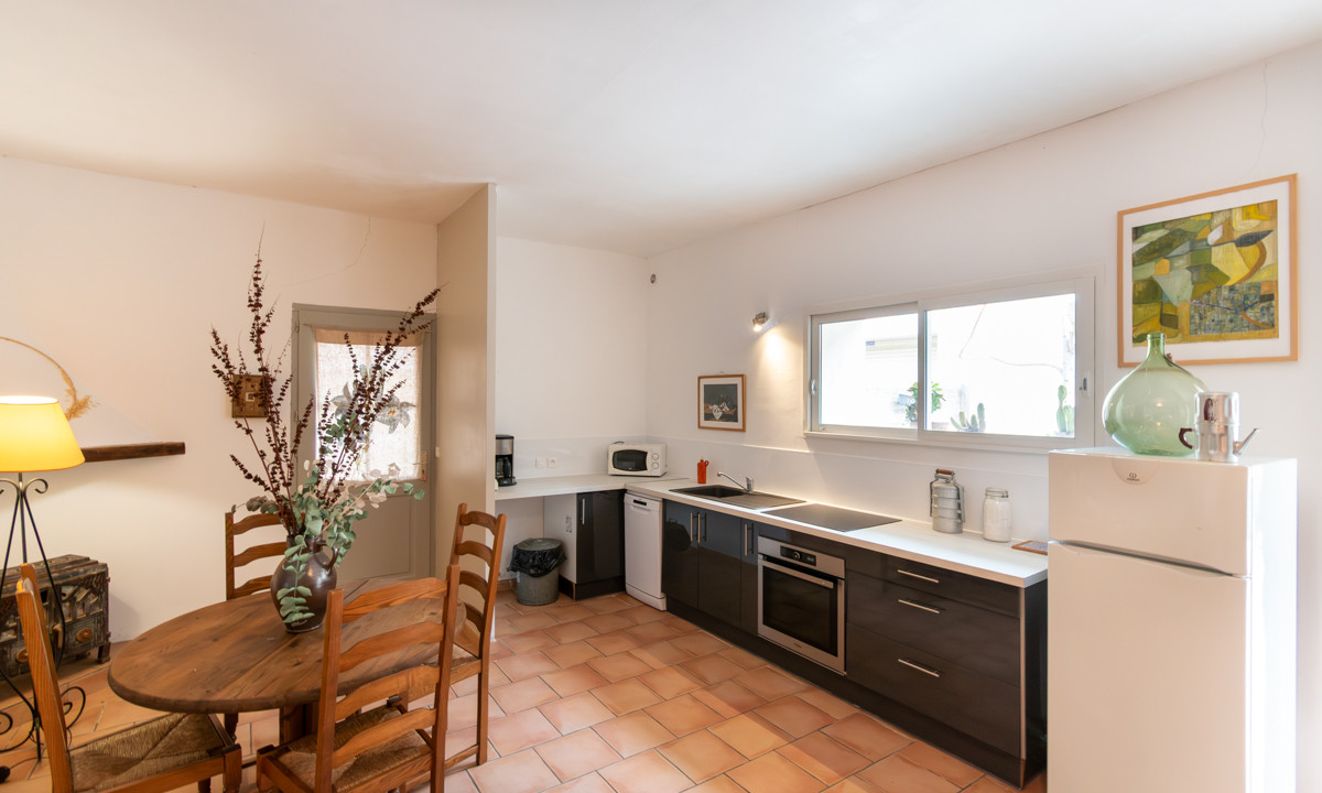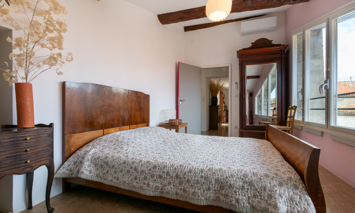 A42864JAV11 - Renovated former agricultural building in the heart of Sigean, within walking distance of restaurants and shops and only 14 minutes from the beach. The property consists of a spacious main house and a fully independent gîte with its own entrance and 50 m² courtyard. Both can also be connected internally via the impressive 55.5 m² former stable. The main house offers a bright cathedral-ceiling living room with open-plan kitchen, 4 bedrooms, and a 27 m² south-west-facing patio. The gîte includes 2 bedrooms. A major advantage is the 58.25 m² garage. Ideal as a family home with rental potential, guest accommodation or furnished long-term rental.