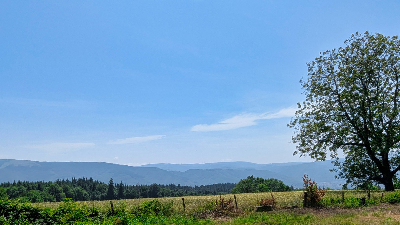 The grounds are beautifully presented; the house looks out over a lush lawn dotted with mature trees and shrubs to a panorama of forested mountains.