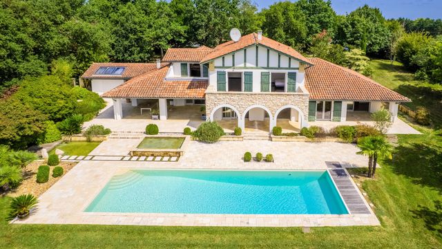 A38425KRK64 - This exceptional 5-bedroom villa is located at the end of a private cul-de-sac in Arcangues, just minutes from the renowned 18-hole Arcangues Golf Course and 10 minutes from Biarritz and its airport. Offering nearly 400 m² of living space and set on 2.4 hectares of landscaped land, the property boasts panoramic mountain views, total privacy, and elegant finishes throughout. Features include a heated pool, exotic wooden floors upstairs, a luxury kitchen, outdoor kitchen, and garage for 4 cars. Several areas on the ground floor require repair due to a water leak — an opportunity to personalise the space to your taste. Rare opportunity in a peaceful yet prestigious location close to beaches, golf, and village life. Information about risks to which this property is exposed is available on the Géorisques website : https://www.georisques.gouv.fr