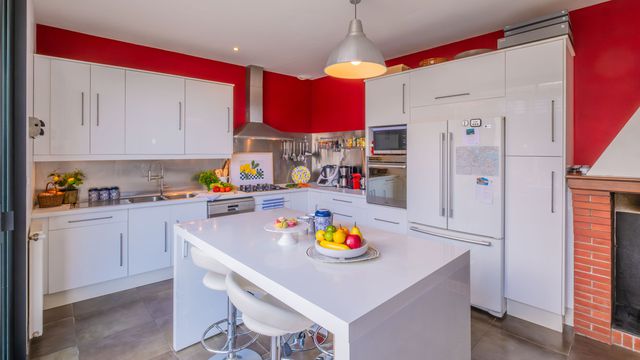 The main house offers generous living space with a sleek modern kitchen, pocket sliding doors, and original features such as solid wood doors, tiled floors, and exposed beams. The spacious lounge and dining area are perfect for relaxing or entertaining, and there's a convenient ground-floor office.