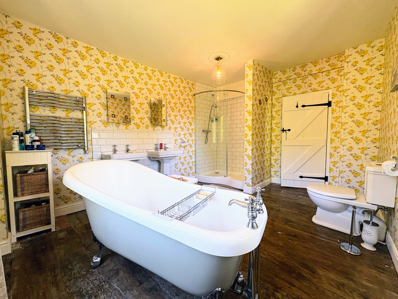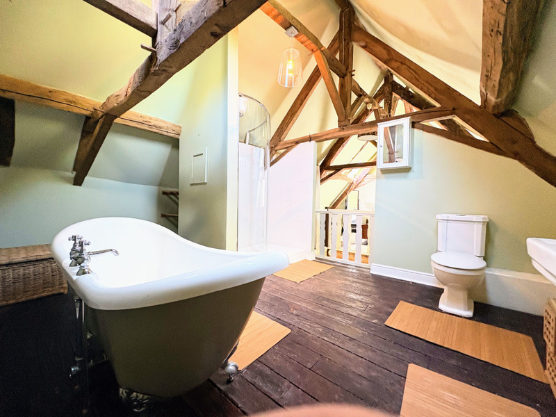The second floor, converted attic space, boasts a unique open-plan bedroom suite (38.8m²), complete with slipper bath, a generously-sized shower, and a WC – an inviting retreat with character and privacy.