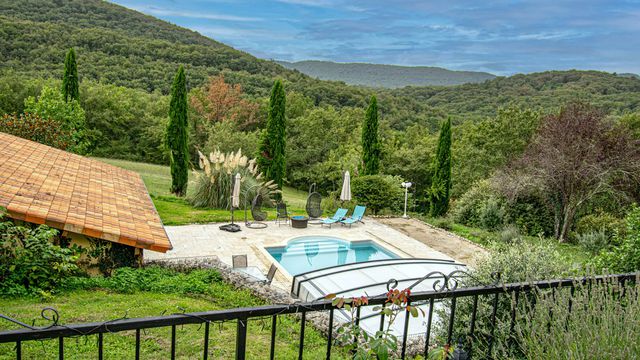 It enjoys an exceptional setting with breathtaking views over a vast forest and is surrounded by nearly 6 hectares of grounds adorned with fruit trees.