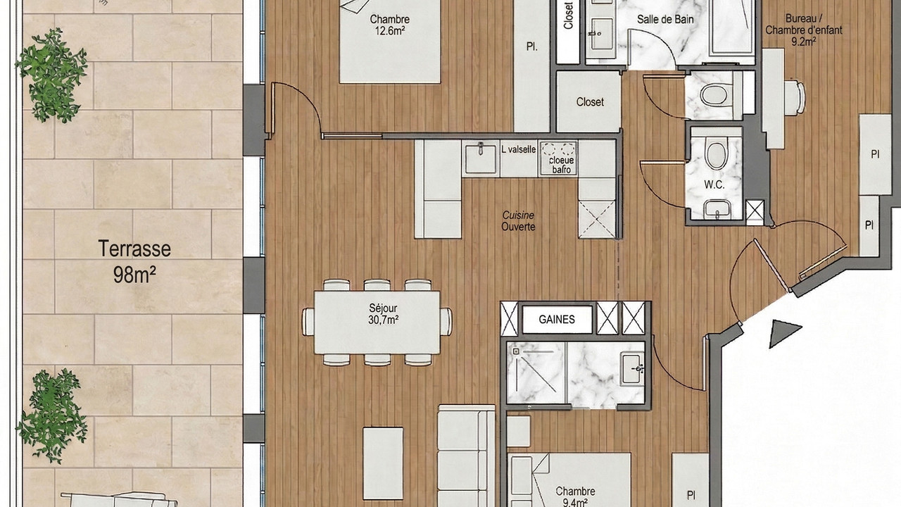 The layout features a spacious open-plan living room with kitchen, two bedrooms plus a child's bedroom or office, integrated air conditioning and modern finishes throughout.