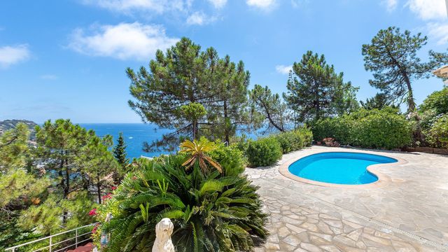 With a living area of approximately 120 m², the property features on the ground floor a spacious reception room with fireplace, a fitted kitchen and two bedrooms, one with direct access to the terrace and swimming pool. Upstairs, a master suite with private bathroom and balcony overlooks the sea. A garage, cellar, and technical room complete the lower level.