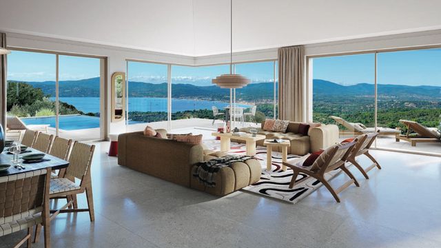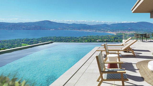 In one of the most sought-after and secure private estates in Beauvallon, a superb new villa offers panoramic views over the Gulf of Saint-Tropez and the surrounding hills.