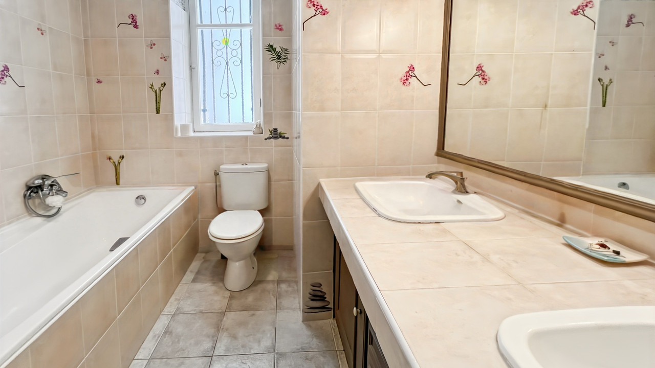 Ground floor apartment 98m² + land 150m². 4 rooms, 2 beds, 2 baths. 3 parking places. 250m from sea.