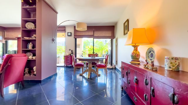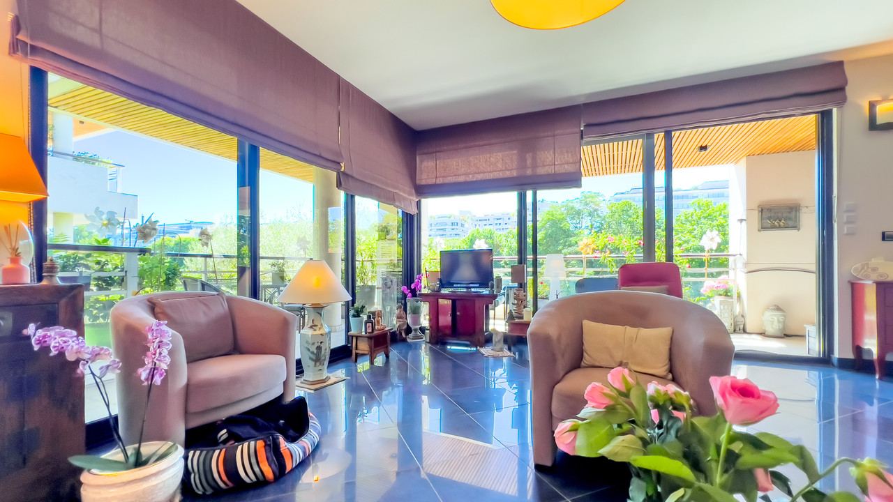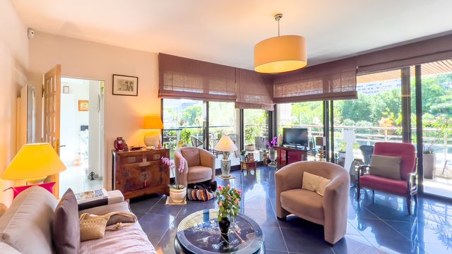 Comprising: a lovely sunny living room (41m2) with 13m of full-height picture windows opening onto the terrace, on the wooded promenade side, perfect for an aperitif al-fresco or dinner with friends, a fully-equipped kitchen, a WC + utility corner, 2 bedrooms (3rd bedroom possible), a bathroom with WC and a shower room.