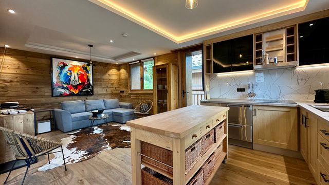 This 200m2 chalet is divided into 2 independent accomodation (4 and 3 bedrooms) with :
