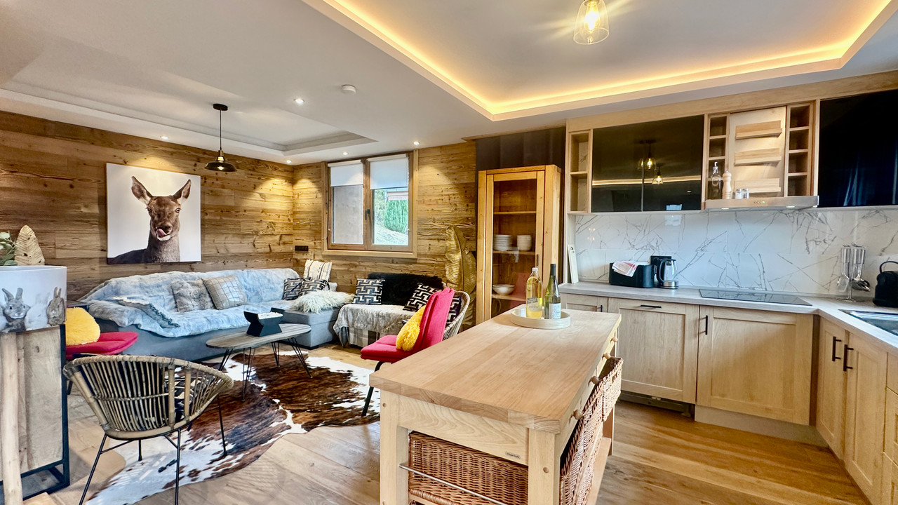 This 200m2 chalet is divided into 2 independent accomodation (4 and 3 bedrooms) with :