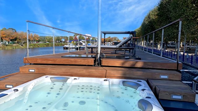 Exterior: 1 terrace of 100m² 1 bioclimatic pergola 1 7-person jacuzzi Technical spaces: 1 forward peak of 13m² 1 aft peak of 5m² 1 technical room in the hold of 10m² 1 engine room of 20m² 1 wheelhouse of 4m² Boat length: 38.95m Width: 5.05m Height: 3.8m