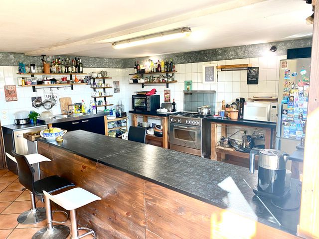 1) the main house with a big dining room and kitchen, a cosy living room, a utility room, a bathroom. At the floor, 4 on suite bedrooms.
