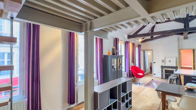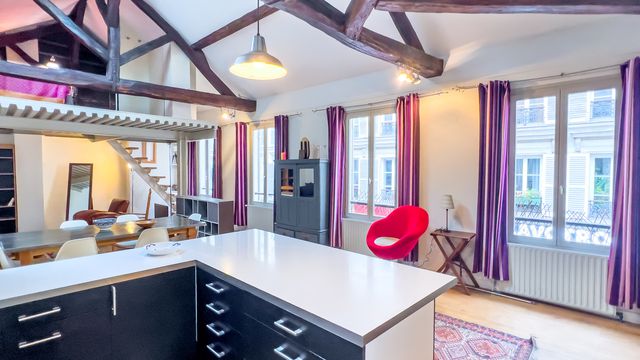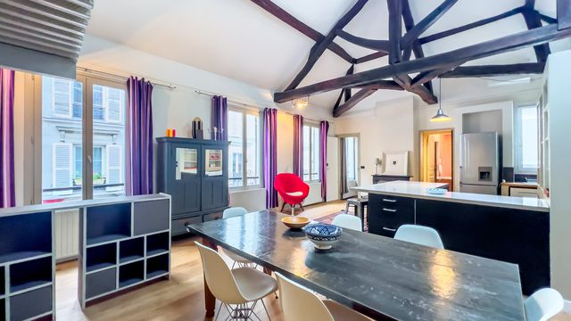 offering 88m² of living space (72m² Carrez law), with private access, this dual-aspect apartment benefits from rare volume with its 4.69m ceiling height. It has 5 full-height double-glazed windows on the street side, 4 openings + 2 Velux windows on the courtyard side for maximum light.