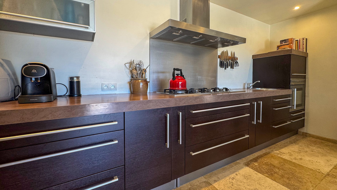 With approx. 220 m² of mainly single-level living, the home features a striking cathedral-ceiling living/dining room with fireplace, a fully equipped kitchen opening onto a sun-drenched terrace, and a luxurious master suite with dressing and private bathroom. A bright garden room with wood burner ensures year-round comfort.