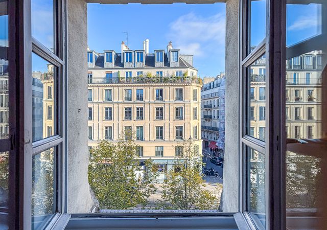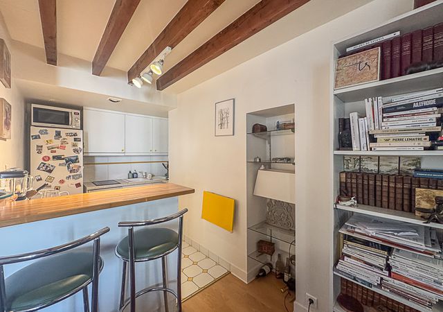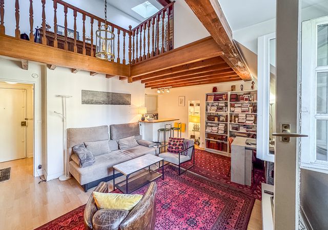 On the first level, you will find a spacious living room with exposed beams, an open-plan equipped kitchen, a dining area, and a bathroom. Upstairs, a bedroom with built-in storage, illuminated by two skylights with electric shutters. Quiet and without overlooking neighbors thanks to its elevated position. Perfect for lovers of Parisian architecture and those seeking a pied-à-terre in the heart of the capital.