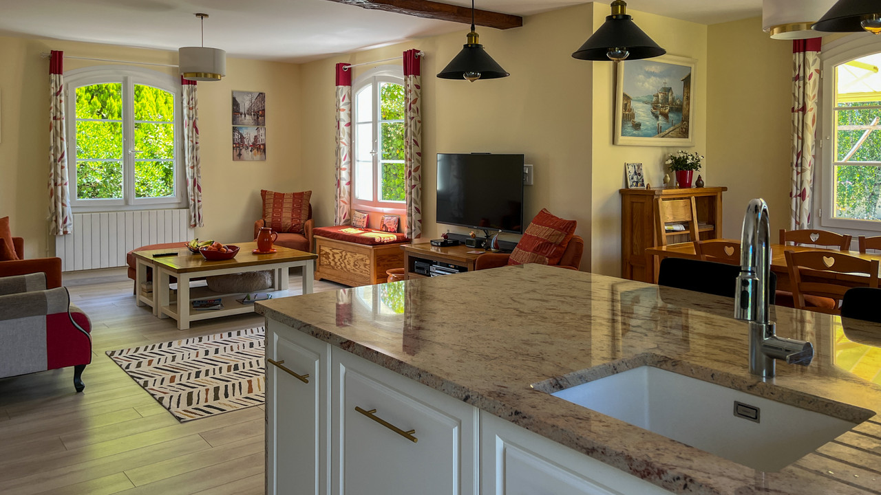 A38632JMR17 - Situated in the peaceful commune of Meursac with the seaside resorts of Royan and Saint-Georges-de-Didonne just a short drive away, this beautifully presented modern property offers 231m² of stunningly light and bright living accommodation, 4 great-sized bedrooms (2 of which are en-suite), a lovely landscaped garden of about 1.5 acres and a large terrace overlooking the garden and open fields beyond.